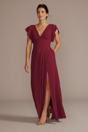 This stunning chiffon bridesmaid dress features delicate flutter sleeves and a flattering V-neckline, perfect for any bridal party. The flowy chiffon fabric drapes beautifully, creating a soft and romantic look. The V-neck adds a touch of elegance, while the flutter sleeves add a fun and feminine touch. This dress is available in a variety of colors to suit any wedding theme or color scheme. Whether you're a bridesmaid or a guest, this dress is sure to make you feel beautiful and confident on the big day.