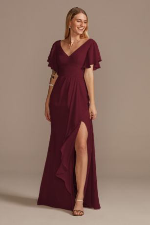 Soft flutter sleeves, a V-neckline, and a statement ruffle give this chiffon bridesmaid dress a modern boho feel.