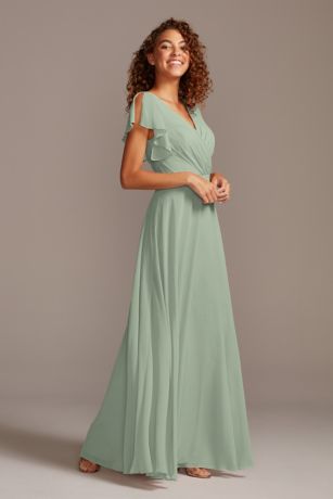 The delicate chiffon fabric of this dress drapes beautifully, creating a soft and elegant silhouette that is perfect for any wedding. The plunging-V neckline adds a touch of allure, while the flutter sleeves provide a feminine and romantic touch. The full circle skirt moves gracefully with every step, making it ideal for dancing the night away. Whether you're a bridesmaid or a guest this dress is sure to make you feel like a princess. Available in a variety of colors, this flutter sleeve full skirt bridesmaid dress from David's Bridal is a timeless and versatile choice for any special occasion.