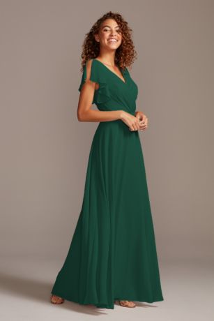 The delicate chiffon fabric of this dress drapes beautifully, creating a soft and elegant silhouette that is perfect for any wedding. The plunging-V neckline adds a touch of allure, while the flutter sleeves provide a feminine and romantic touch. The full circle skirt moves gracefully with every step, making it ideal for dancing the night away. Whether you're a bridesmaid or a guest this dress is sure to make you feel like a princess. Available in a variety of colors, this flutter sleeve full skirt bridesmaid dress from David's Bridal is a timeless and versatile choice for any special occasion.