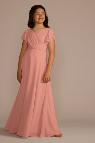 From the softly pleated, V neckline to the billowy, floating full circle skirt, this long chiffon junior bridesmaid dress gives a dreamy aura. The faux-wrap style bodice is finished with soft flutter sleeves.