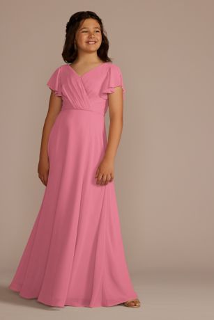 From the softly pleated, V neckline to the billowy, floating full circle skirt, this long chiffon junior bridesmaid dress gives a dreamy aura. The faux-wrap style bodice is finished with soft flutter sleeves.