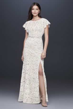 This sleek sheath gown is the perfect way to add a touch of color, thanks to the soft champagne lining that shows through the allover illusion lace. Flutter sleeves provide a touch of coverage while the slit skirt shows off a fun pair of heels. Finished with a self belt.