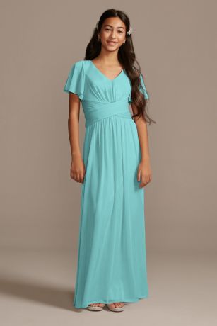 With a crisscross waistband and flowing flutter sleeves, this V-neck mesh junior bridesmaid dress is a perfect pick to pair with the bridal party. The full skirt has an extra-wide sweep that's great for twirling.