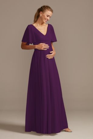 With a flattering crisscross waistband and flowing flutter sleeves, this V-neck mesh maternity bridesmaid dress is a party-pleasing pick. The full skirt has an extra-wide sweep perfect for twirling.