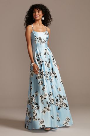 A floral foil print tops this timeless mikado ball gown, lending a bit of shine to your look. Finished with side pockets and spaghetti straps.