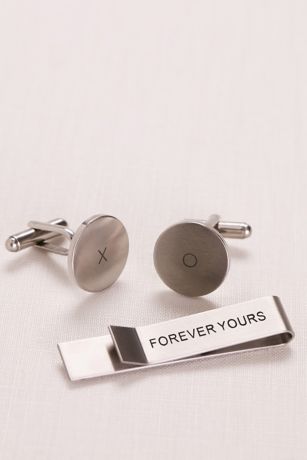 There is something so special about giving your groom accessories he can wear on your wedding day. The words "Forever yours" are sweetly (but secretly) stated on the back of this tie bar, and the cufflinks are engraved with an X and an O.