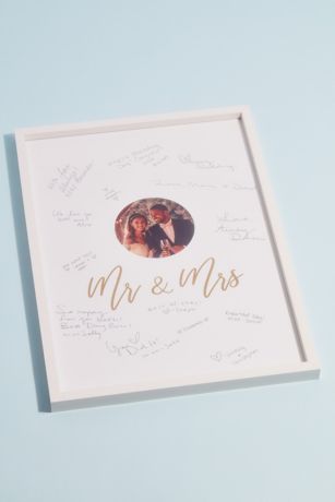 Instead of a traditional guest book, have your guests sign this framed Mr & Mrs sheet. It's an easy way to display their well wishes in your home. Slip in your own photo before the wedding!
