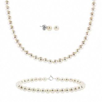 What is lovelier than pearls for the perfect flower girl. This 3 piece set of 4-5mm freshwater pearls consists of a 15 inch necklace, 6.5 inch bracelet and pearl stud earrings. Earrings are for pierced ears only. All are finished with sterling silver findings. This set is available in white. This set is shipped in a white leatherette box perfect for gift giving.