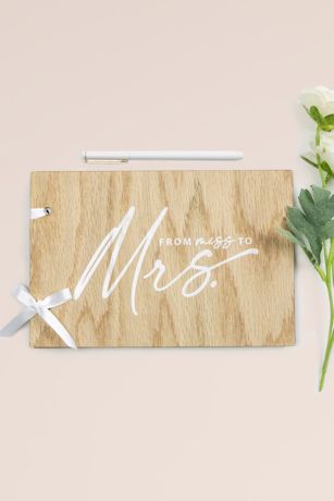 This wooden guest book reads "from Miss to Mrs." in elegant scripted font and is tied with a soft satin ribbon.