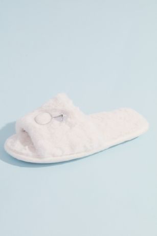 These fuzzy bride slippers are perfect to wear while you get ready on the big day. One foot reads "bride" and the other features a diamond ring.