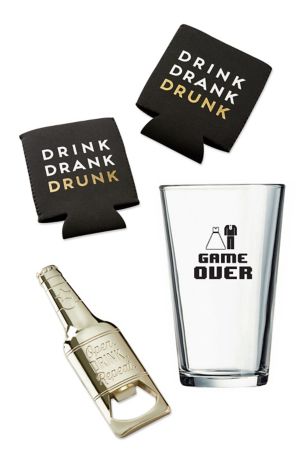 It's not just the bride that asks her team to stand beside her with a token of her appreciation, but the groom, too! The Game Over Beer Kit is just the cheeky and fun gift set for the groom to use to treat his groomsmen, and may be used as asking gifts or as part of a thank you gift package to the guys who stood beside him each step of the way. The Game Over Beer Kit comes with a Game Over 16oz. Pint Glass, a Gold Beer Shaped Bottle Opener, and a set of 4 Drink, Drank, Drunk insulated drink sleeves. Looking to spruce up the bachelor party? This gift set might be what you were searching for all along!