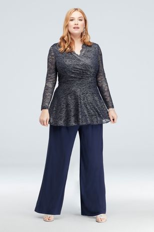 The scalloped metallic lace top of this wide-leg pantsuit is gathered at the side into a figure-flattering silhouette. The look is completed by slinky wide-leg trousers.