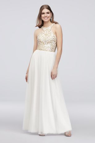 Adorned with a geometric sequin-embellished bodice and finished with a flowy mesh skirt, this A-line dress is a glamorous combination of timeless and modern.