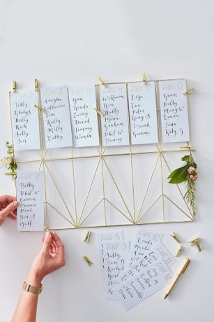 Put your table plan on display for your guests in this stunning wire-frame stand. Includes 12 gold-foil cards and 30 gold metal pegs.