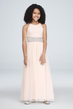 This floor-length lace and jersey junior bridesmaid dress is encircled with a sparkling beaded waistline, for the perfect bit of bling.