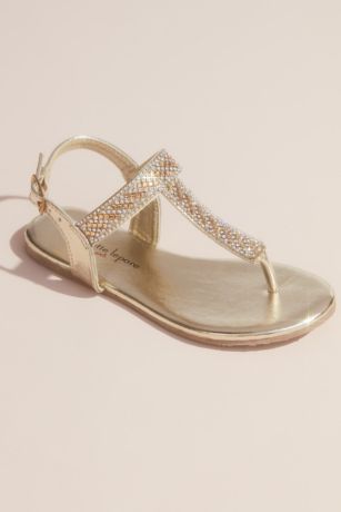 A treat for little feet, this pair of thong sandals features metallic straps and rhinestone embellishments.