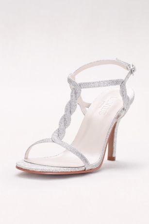 These walkable high-heel sandals feature braided straps and a glittery finish.