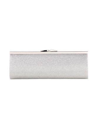 - Glitter elongated clutch. Satin lining. Inside pocket. Kiss-lock closure. Shoulder chain.
