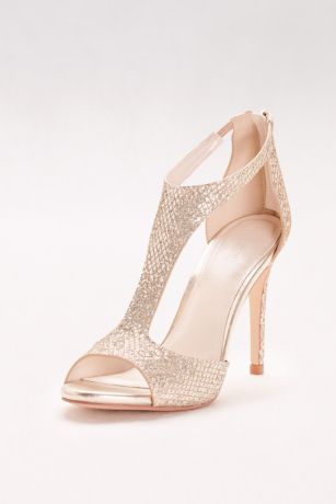 Sparkling with a glittery gold print, these stiletto T-straps are simply stunning.
