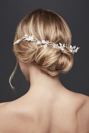 This glittery floral hair vine with pearls and crystals looks lovely woven through a loose braid, tucked around a sleek chignon, or wrapped around the hairline like a flower crown.