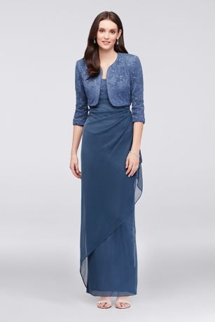 This sheath petite dress is a perfect way to add some shine to your mother-of-the-bride look. Featuring a glitter jacquard bodice with matching jacket, and a faux-wrap mesh skirt.