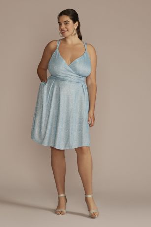 Glitter sparkles from every inch of this short A-line dress, making it a homecoming-ready ensemble. A faux-wrap bodice enhances the silhouette, and double spaghetti straps add a flirty detail.