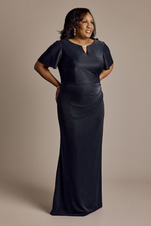 The shimmering glitter knit of this beautiful sheath dress subtly catches the light at every angle. A whimsical flutter sleeve and keyhole neckline combine for a modern sophistication, perfect for any big day.
