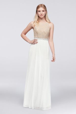 Sculpted shoulders define the glitter lace bodice of this long matte jersey dress, as a beaded waistband adds a touch of sparkle.