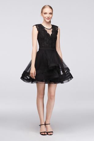 Ready to dance? Try this new take on the two-piece dress, featuring a lace bodysuit with illusion neckline and a matching tiered mesh mini skirt.