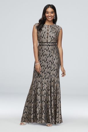 Delicate scalloped flutter sleeves cap the high-neck bodice of this glittering floral lace mermaid gown.