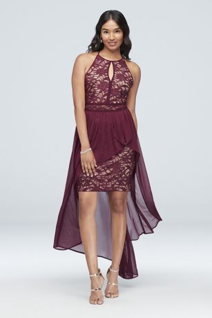A winning combination of flowy and fitted, this short glitter lace dress features a halter keyhole neckline, a strappy back design, and a chiffon overskirt.