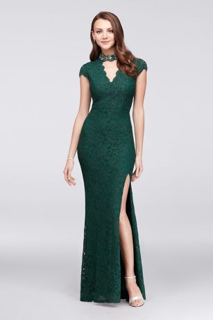 A dazzlingly beaded cutout neckline adds an uniquely elegant touch to this cap-sleeve, glitter lace mermaid gown.