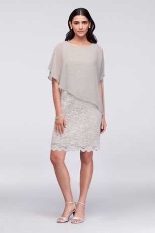 This simple sheath dress silhouette shines in glitter lace, and is detailed by a sophisticated chiffon capelet.