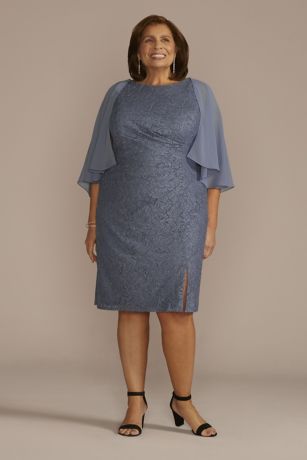 An elegant option for Mom's upcoming special occasions, this gorgeous set features a glitter lace sheath dress, designed with a subtle slit and removable floating chiffon capelet.