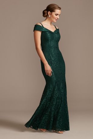 This sleek, stretch-lace mermaid dress glitters under the lights of the dance floor, as a cuffed cold-shoulder neckline creates a stunning focal point.