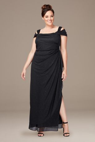 A cowl neckline, cold-shoulder styling, and a ruched sheath skirt lends this glitter mesh plus-size dress head-turning detail.