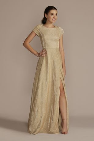 Glitter metallic fabric adds to the captivating look of this long A-line dress perfect for prom. The skirt slit is made for showing off your best sparkly heels!