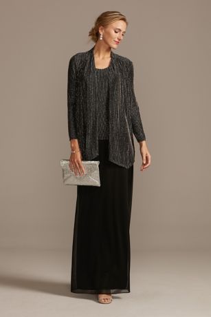 Glittery metallic stripes detail the open-front waterfall jacket and faux-tank shell of this dress and jacket set. The glitzy bodice is paired with a sleek skirt with a floaty chiffon overlay.