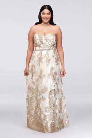 Branches of glittery leaves scatter across this mesh ball gown, adding detail and dazzle. An iridescent beaded waistline adds a sparkling finishing touch.