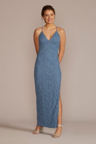 At prom or your next special occasion, add one more reason to celebrate ... you in this dress! Glitter stretch lace fits your body perfectly, highlighting your natural figure while making it easy to mix and mingle all night long.