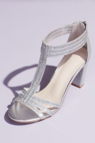 Add extra dazzle to any occasion look in these eye-catching metallic block heel sandals. Crystal embellishment along the ankle and toe straps complete the look.