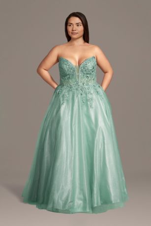 This off-the-shoulder ball gown dazzles in glitter tulle with sparkling appliques and a plunging neckline. A lace-up back and detachable straps add versatility to this glamorous, statement-making look that's perfect for prom.