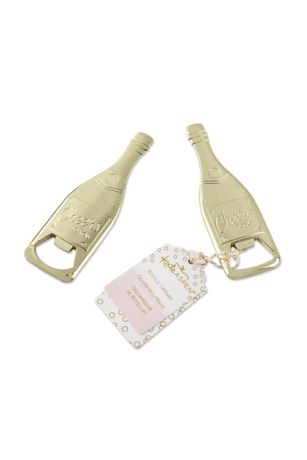 Love the look of champagne but prefer the taste of a pop-top beverage? Gold Champagne-Shaped Bottle Opener is the perfect two-in-one favor---shaped like a champagne bottle but perfect for popping the top on your favorite libation. This fun, unique bottle opener has ""Cheers to You"" engraved on it and makes a great favor for guests at your wedding, bridal shower, bachelorette party or birthday.
