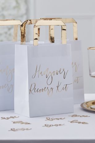 Take care of your bachelorette or wedding guests with these "hangover recovery kit" bags. Fill them with everything they might need for the morning after the party like snacks, water, headache meds, and sweet treats.