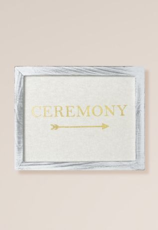 The picture of rustic refinement, this wood framed, gold-foil-on-linen sign directs guests to the ceremony.