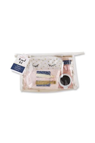 Have everything you need all tied up in one pretty package with the Gold Glam Travel Kit! The kit is the perfect bridal party gift for a destination wedding or to give the girls at a bachelorette party. The gift set includes a pair of ear plugs, a sleep mask, a pair of socks, 3 hair ties, and a mirror and brush combo. The travel kit is packaged in a clear vinyl case and comes ready for gifting!