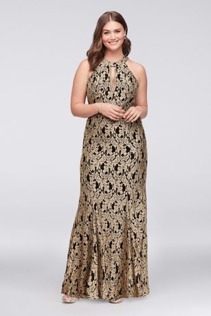 Glittering gold floral lace laid over a black lining creates a chic tonal contrast on this round-neck mermaid gown.