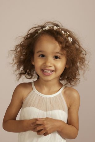 Give the flower girl a sweet halo of her own with this crystal-embellished gold vine headband topped with sheer organza ribbons.