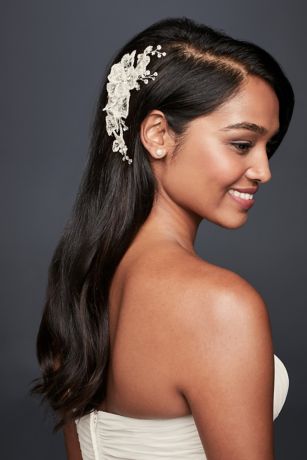 Topped with crystal dew drops, airy webs of floral lace form this hair clip's delicate petals.